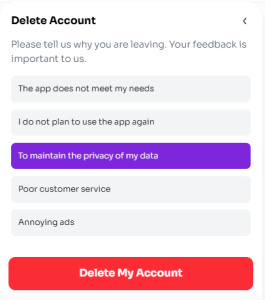 Step3: Select Reason of Account Deletion and Click “Delete My Account”